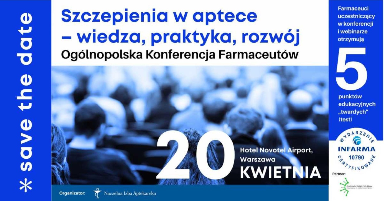 Naczelna Izba Aptekarska ma zaszczyt zaprosić PaÅ„stwa do udziaÅ‚u w Ogólnopolskiej Konferencji Farmaceutów „Szczepienia w aptece – wiedza, praktyka, rozwój”, która odbÄ™dzie siÄ™ w dniu 20 kwietnia 2026 roku w Hotelu Novotel Airport w Warszawie.
